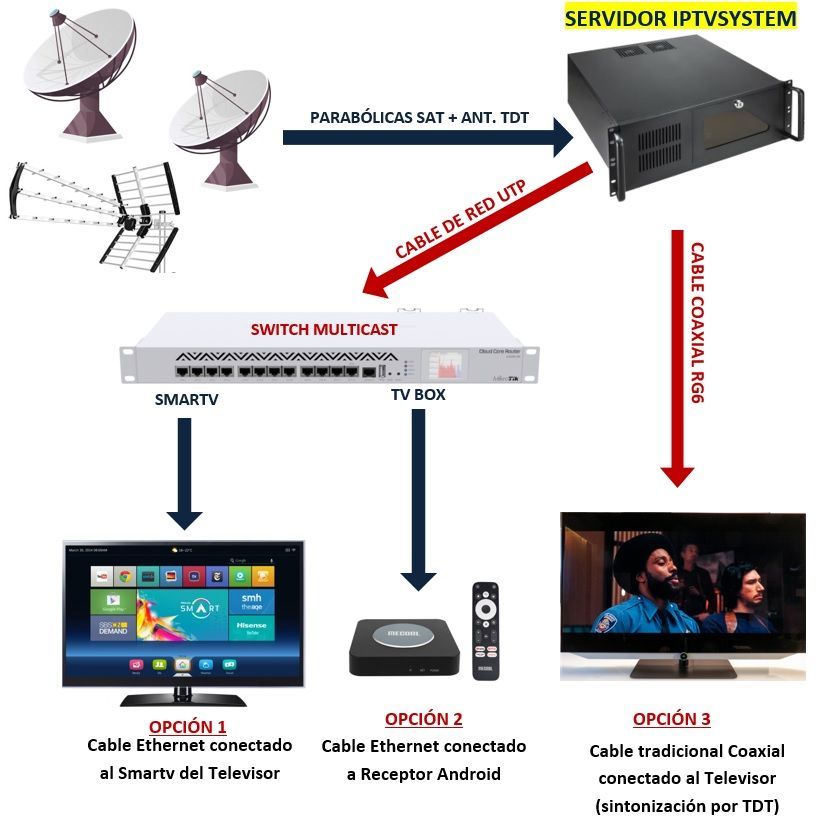 o 3º Cable Coaxial TV. Si aún dispone de una instalación de TV coaxial, también podemos emitir todos los canales por la misma infraestructura. Se sintonizarían las TV´s por cable o aéreo y los canales saldrían ordenados desde el propio servidor. Con ese sistema no podemos crear un canal promocional personalizado por cada habitación/apartamento, pero sí se puede crear un canal promocional de información general. Incluso varios canales en varios idiomas con un máximo de 5 canales promocionales.