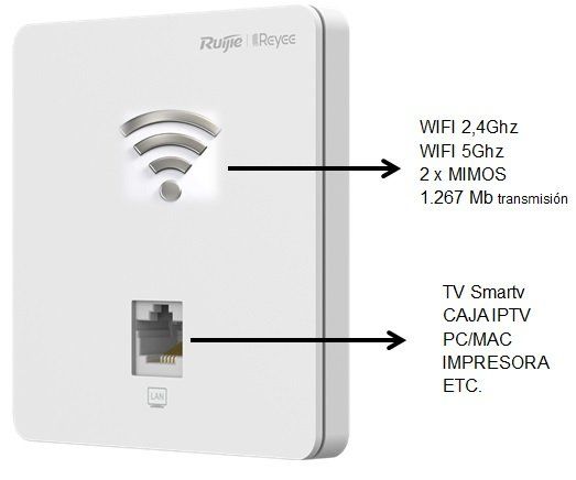 Toma Wifi con un diseño compacto y discreto para instalar en caja de mecanismo de pared. Wifi omnidireccional con doble banda y velocidad de transmisión de hasta 1.267Mbps.